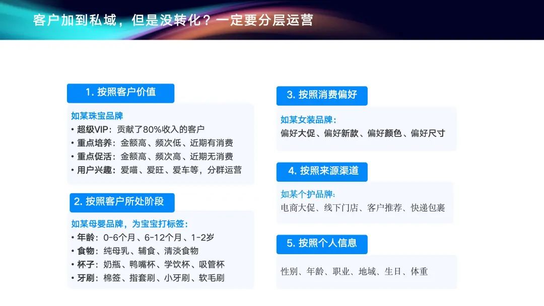 1)他们在吸引私域粉丝时非常注重精准性,而不是盲目添加大量粉丝。在添加粉丝后,他们还会进行细致的分层运营,而不是一视同仁地对待所有客户。